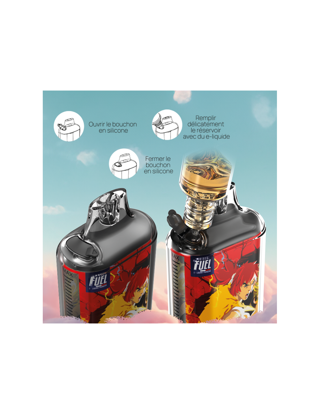 Le matériel est pré-rempli avec 2 ml d’e-liquide et livré avec deux flacons de 10 ml, permettant de recharger intégralement le réservoir et d’atteindre une autonomie totale annoncée de 32 000 bouffées. Le système reste simple, intuitif et accessible à tous les profils de vapoteurs.
